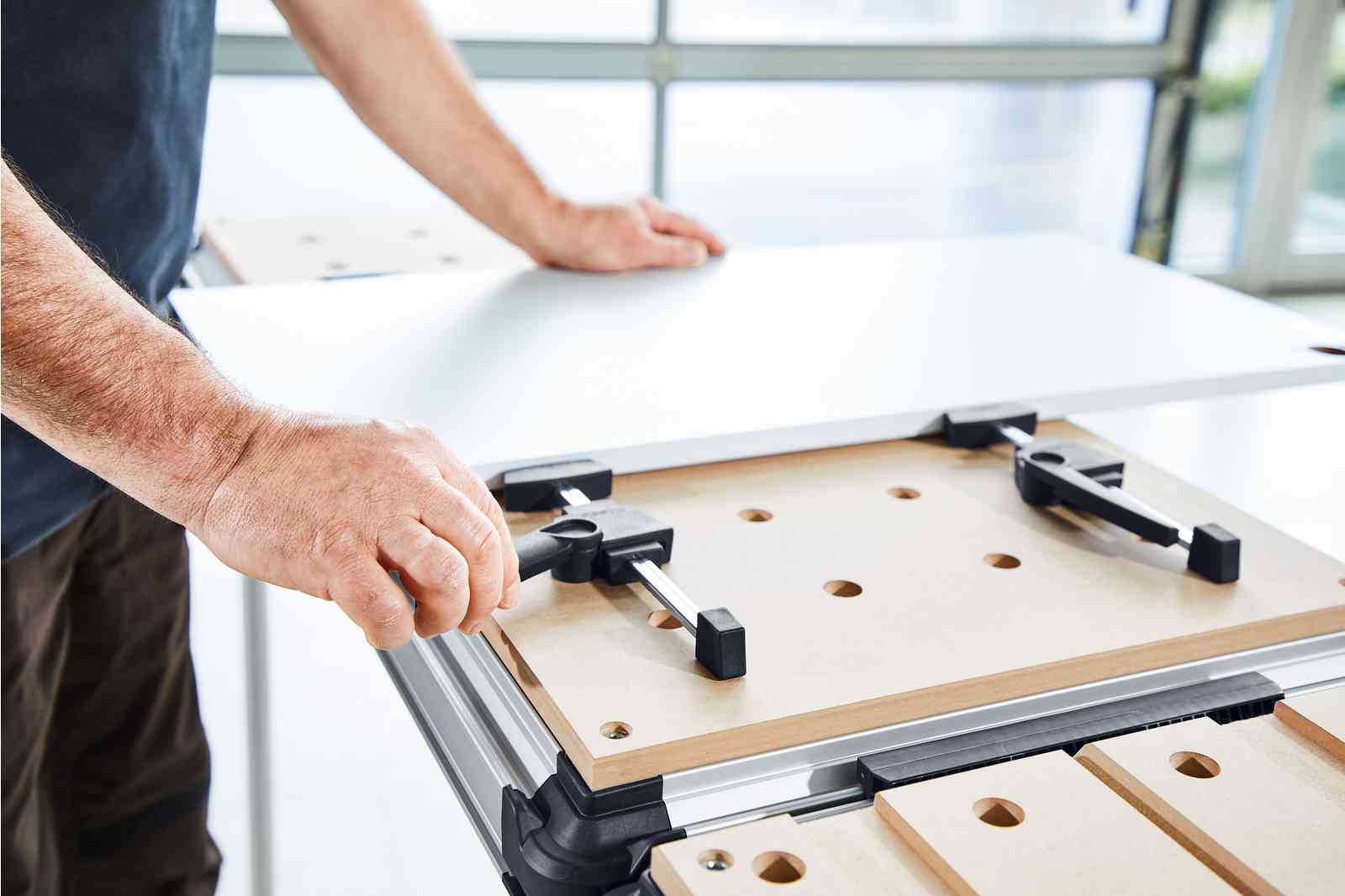 - Разные способы крепления заготовок на устойчивой рабочей поверхности из перфорированной плиты и алюминиевого профиля